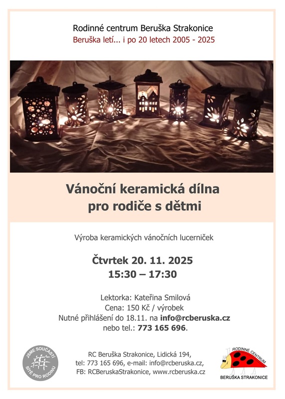 Přijďte si do Berušky vyrobit keramickou vánoční lucerničku. Lektorkou bude Kateřina Smilová. Cena 150 Kč / výrobek. Nutné přihlášení do 18.11. na info@rcberuska.cz nebo tel.: 773 165 696.