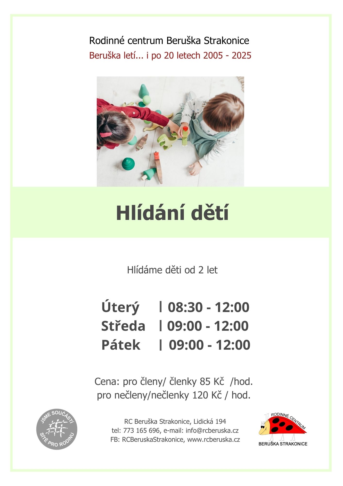 Hlídání dětíHlídání dětí od 2 let. Členi 85 Kč / hod., nečleni 120 Kč / hod. Časové úseky události (3) Úterý 8:30 - 12:00 Středa 9:00 - 12:00 Pátek 9:00 - 12:00 admin-Bara